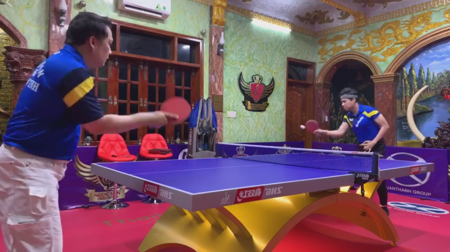 Ngọc Sơn đấu bóng bàn với HLV Hồ Thiện Vinh.