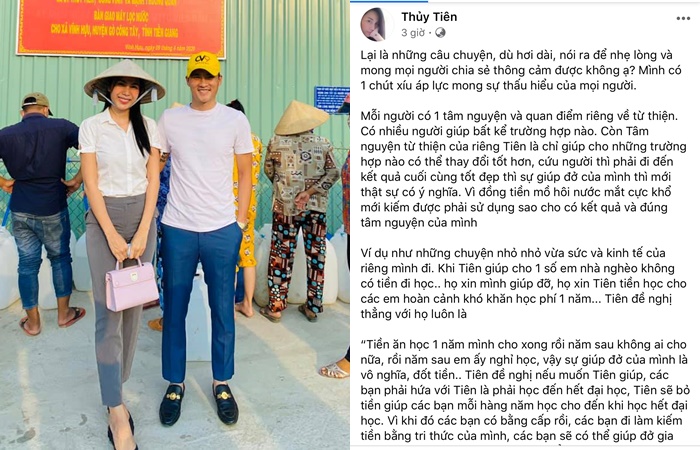 Mới đây, trên trang cá nhân, Thủy Tiên đã đăng một bài viết rất dài chia sẻ về nỗi lòng của mình, mong rằng sẽ được NHM ủng hộ và thông cảm. Theo như những gì nàng Wag đề cập, cô luôn có một quy tắc rất rõ ràng trong những hoạt động từ thiện, không bao giờ tiếc tiền nhưng chỉ giúp đỡ cho những hoàn cảnh có kết quả tốt đẹp về sau. Cũng chính vì điều này mà không ít người đã buông những lời trách móc và nặng nhẹ, tố Thủy Tiên chảnh chọe.