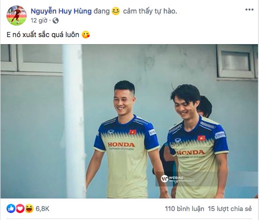 Không chỉ nhận được những lời ngợi khen của NHM, Tuấn Anh còn được các đồng đội ở tuyển Việt Nam nể phục. Trên trang cá nhân, tiền vệ Nguyễn Huy Hùng đăng tải bức ảnh với Tuấn Anh kèm dòng status: “Em nó xuất sắc quá luôn”.