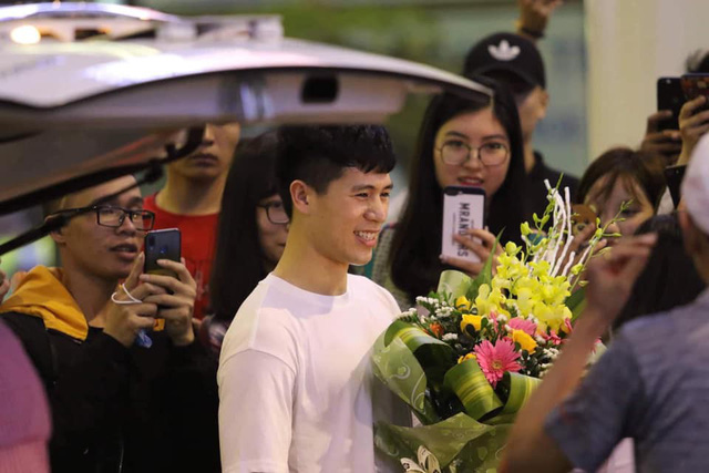 Đình Trọng choáng váng với lượng fan hâm mộ chào đón ở sân bay Nội Bài.