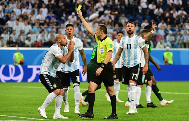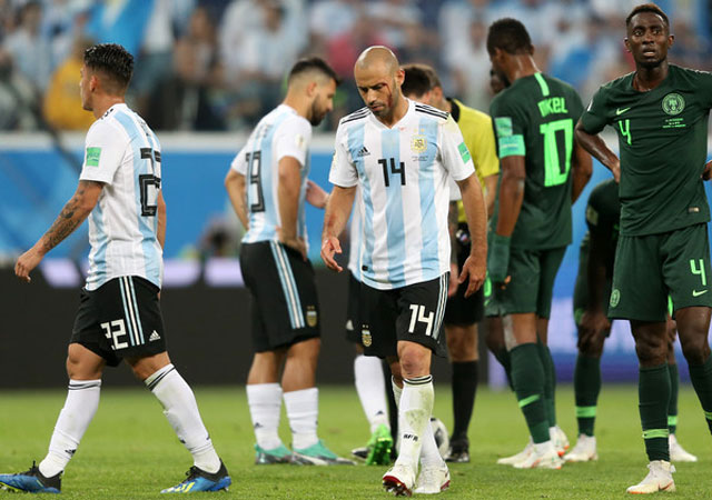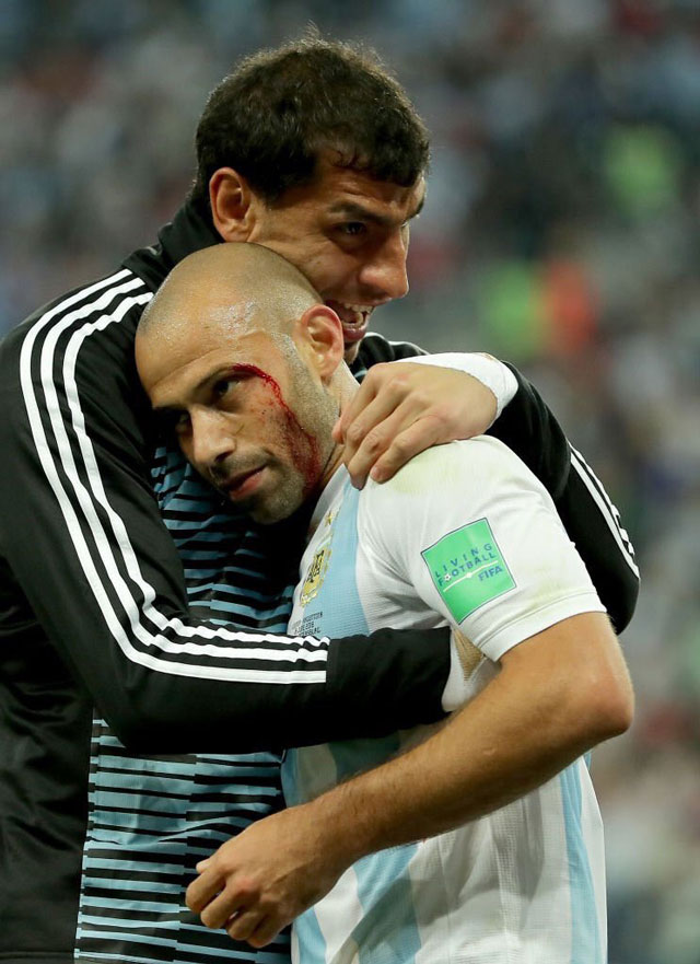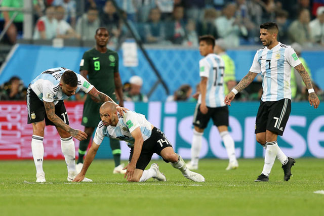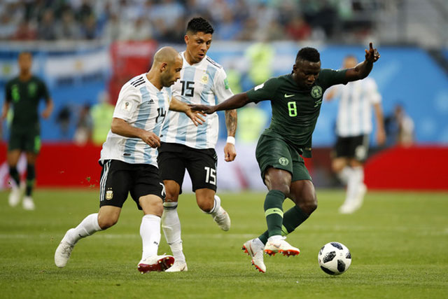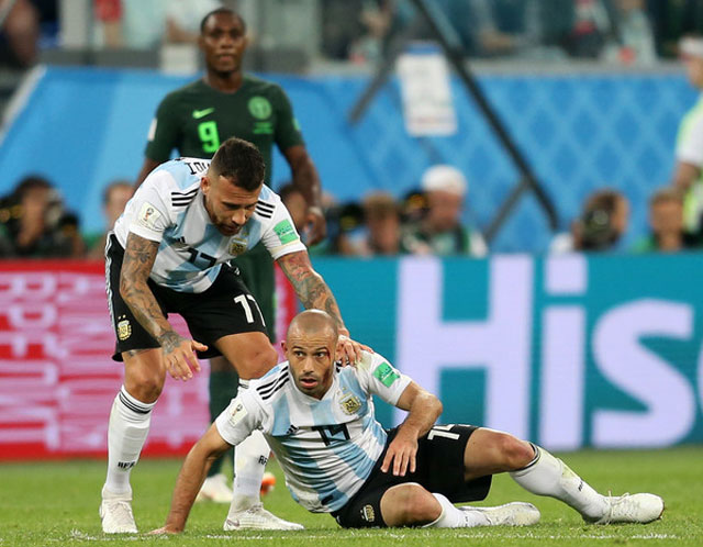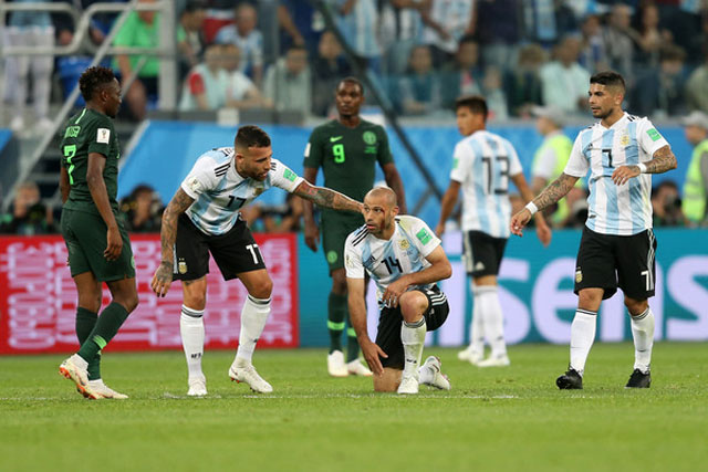 Mascherano nhận thẻ vàng sau pha phạm lỗi với Oghenekaro Etebo dẫn tới quả penalty cho Nigeria vào phút 49. Nhưng khi thấy tinh thần các đồng đội xuống sức, anh hò hét và vực dậy, thúc ép mọi người chiến đấu tới cùng. Ảnh: Getty.