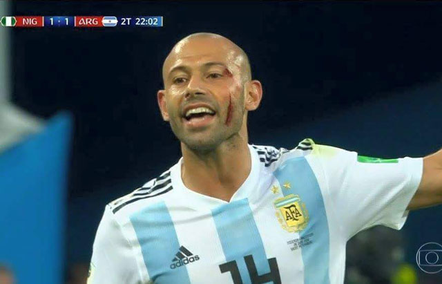 Mascherano đổ máu sau pha va chạm với một cầu thủ Nigeria. Ảnh: Getty.