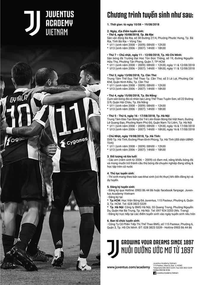 Từ ngày 10/08 - 19/08/2018, Học viện Bóng đá Juventus Việt Nam tuyển sinh khóa I trên toàn quốc. CLB Juventus cử HLV trưởng Học viện Bóng đá Juventus toàn cầu - ông Gianluca Settanni qua Việt Nam để trực tiếp tuyển chọn lứa cầu thủ đầu tiên.