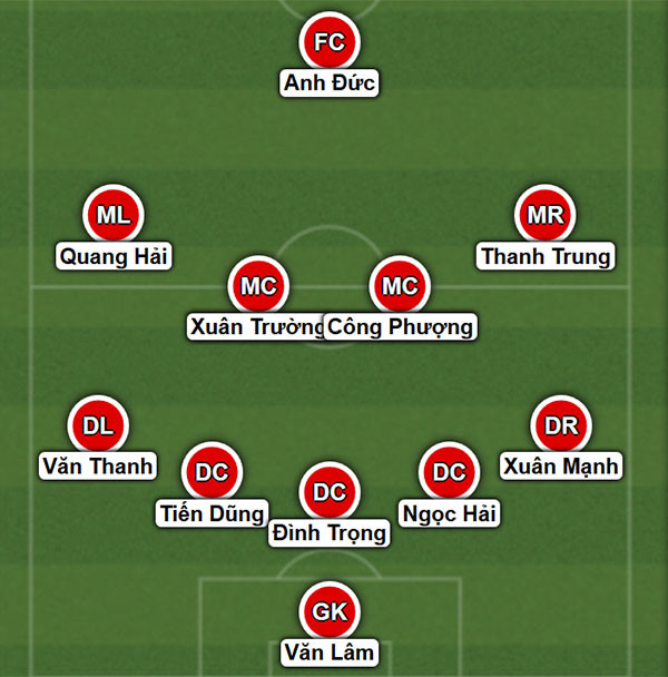 Bước vào trận đấu, HLV Park khiến nhiều người bất ngờ khi tung ra đội hình xuất phát có đến 7 cầu thủ từng góp mặt ở U23 Việt Nam. Bên cạnh đó, Văn Lâm được tin tưởng giao xuất bắt chính trong khung gỗ, dẫn dắt hàng công là tiền đạo Anh Đức cùng với các vệ tinh hỗ trợ gồm: Công Phượng, Quang Hải và Đinh Thanh Trung.