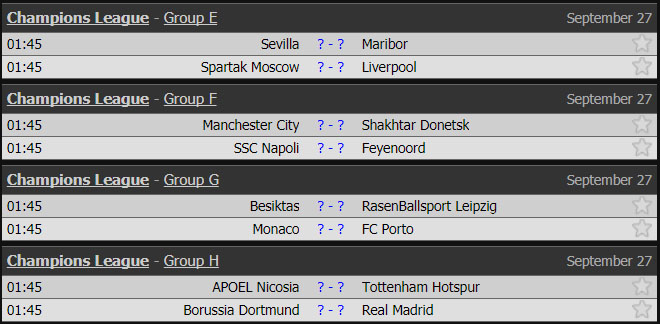 Lịch thi đấu UEFA Champions League các trận diễn ra rạng sáng 27/9.