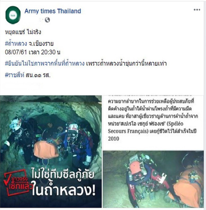 Cụ thể, tài khoản Army times Thailand đã cảnh báo đừng chia sẻ những hình ảnh không thật về vụ giải cứu đội bóng thiếu niên của Thái Lan, kèm theo tấm hình được cho là giả.