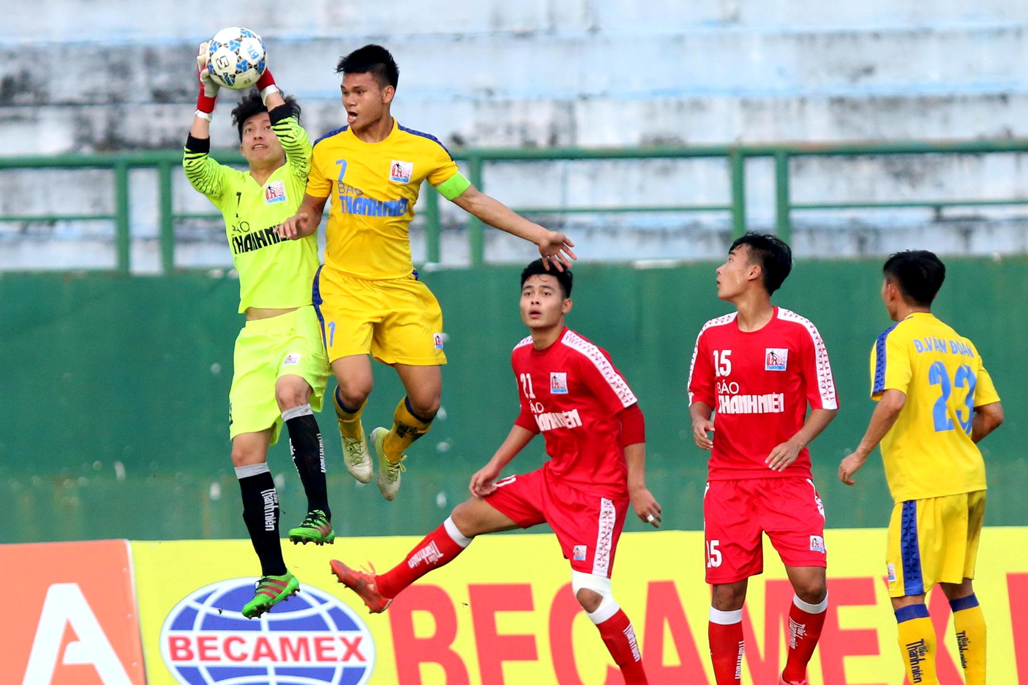 SLNA (áo vàng) đã bị loại. Ảnh: Báo Thanh Niên