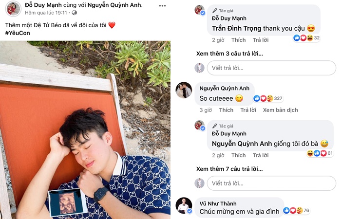 Người vui sướng nhất không ai khác chính là Duy Mạnh, không dấu được sự hạnh phúc, ông bố trẻ tương lai đã khoe hình ảnh siêu âm của con trai lên mạng xã hội với lời nói yêu thương: “Thêm một Đệ Tử Béo đã về đội của tôi. Yêu con“. “Béo” là tên mà cầu thủ sinh năm 1996 đã dành để gọi yêu bà xã của mình, thể hiện sự dễ thương, bầu bĩnh trên khuôn mặt Quỳnh Anh.
