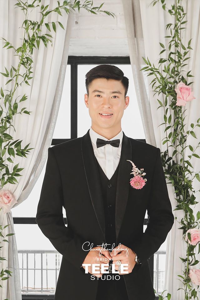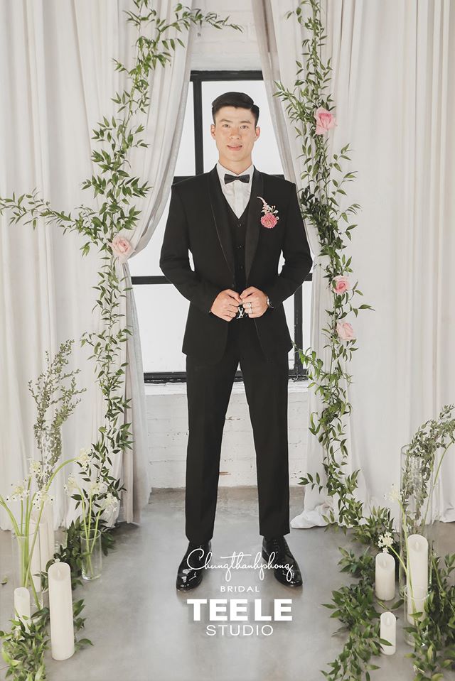 Tối qua, NTK Chung Thanh Phong cũng đăng tải trọn bộ ảnh cưới của Quỳnh Anh - Duy Mạnh. Bộ ảnh mang phong cách hiện đại, được thực hiện tại studio. Duy Mạnh mặc vest đen trẻ trung với phụ kiện nhẫn, đồng hồ đắt tiền. Quỳnh Anh mặc đầm ren màu trắng, tóc buộc gọn, đội khăn voan.