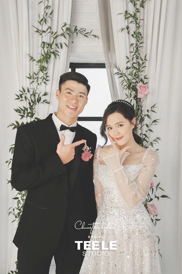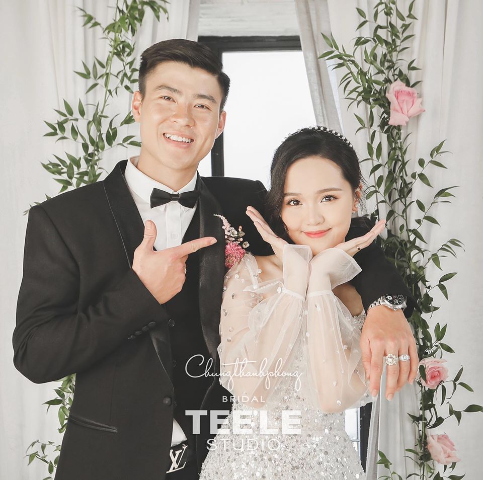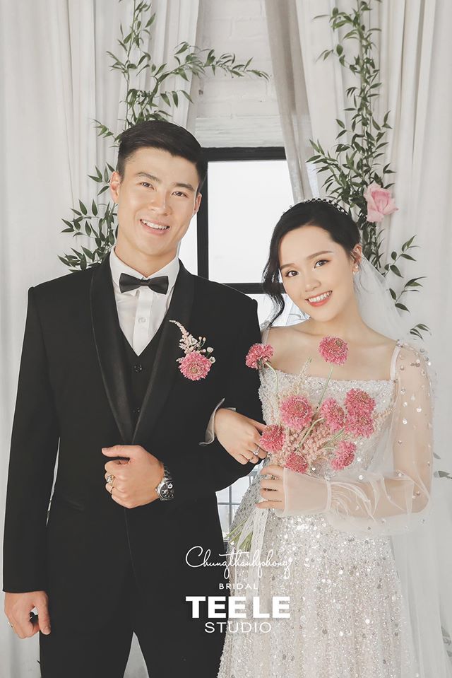 Trước đó một ngày, Quỳnh Anh - Duy Mạnh chia sẻ loạt ảnh cưới theo phong cách cầu thủ bóng đá. Cả hai diện áo thun in số áo gắn liền với sự nghiệp sân cỏ của Duy Mạnh.