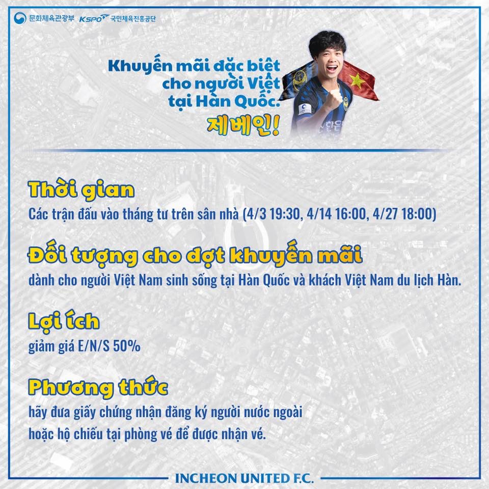 Mới đây, đội bóng xứ Hàn vừa mới đưa ra một ưu đãi dành cho các CĐV Việt Nam. Theo đó, các trận đấu trên sân nhà của CLB Incheon United vào các ngày 3/4, 14/4 và 27/4 sẽ được giảm một nửa giá vé vào sân.