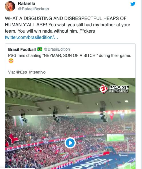 “Hãy nhìn cái cách là lũ *** đó đối xử với anh ấy. Họ muốn có anh ấy ngay từ đầu, họ muốn anh ấy ở lại nhưng lại làm như vậy. PSG sẽ không có bất cứ thành công gì nếu anh trai tôi rời đi“, Rafaella Neymar chia sẻ trên Twitter cá nhân.