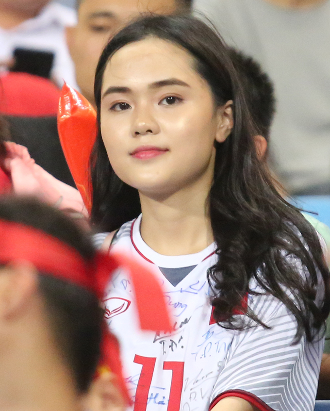 Quỳnh Anh xinh đẹp trong bộ quần áo ĐTVN khi có mặt trên khán đài sân Hàng Đẫy.