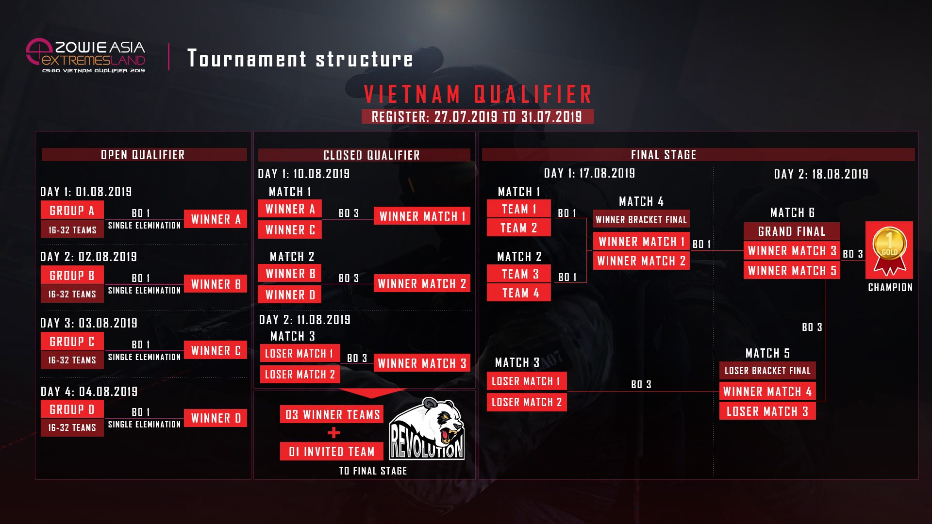 - Thi đấu Onlan tại Vikings Esports Arena vào ngày 18/08/2019 - 3 team vượt qua Closed Qualifiers cùng đương kim vô địch Revolution sẽ thi đấu bo3 nhánh thắng thua để tìm ra nhà vô địch.