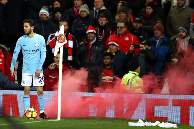 CĐV Man United ném pháo sáng về phía Bernardo Silva.