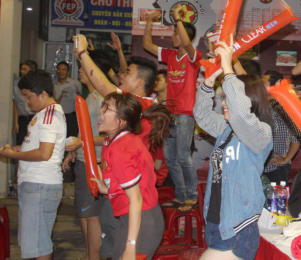 Hình ảnh quen thuộc của cô nàng 9x (đeo kính) trong một buổi offline xem MU thi đấu.