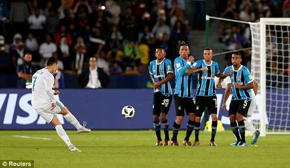 Giữa lúc đoàn quân của HLV Zidane vẫn loay hoay tìm cách xuyên phá hàng thủ Gremio, Ronaldo đã chứng minh giá trị của Quả Bóng Vàng 2017. Phút 53, siêu sao người Bồ tung cú sút phạt hàng rào đẳng cấp mở tỉ số cho Real.