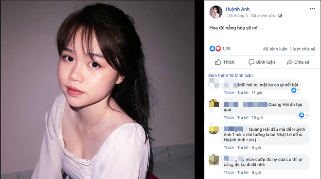 Mới đây nhất, giữa những tin đồn về việc Quang Hải tiếp tục có mối quan hệ “mập mờ” với một hot girl khác có tên Huỳnh Anh, fan của Nhật Lê đã vào tận trang cá nhân của cô nàng để “khủng bố”. Thậm chí, những lời lẽ rất nặng nề đã được những người này để lại ở nhiều bức ảnh của Huỳnh Anh.