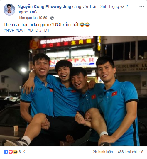 Mới đây trên trang cá nhân facebook, Công Phượng đăng tải trên trang fanpage chính thức của mình bức ảnh anh cười tươi rói khi được Văn Hậu, Tiến Dũng, Đình Trọng hợp sức bế lên. Với caption vui nhộn: “Theo các bạn ai là người cười xấu nhất?” kèm theo biểu tượng mặt cười ra nước mắt hài hước.