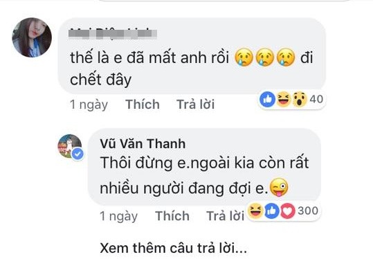 Ngược lại, nhiều fan nữ đã “gào thét” trong ghen tỵ. Có người còn đòi chết khi vào bình luận rằng: “Thế là em mất anh rồi, đi chết đây”. Văn Thanh dí dỏm đáp lại: “Thôi đừng em, ngoài kia còn có rất nhiều người đang đợi em”.