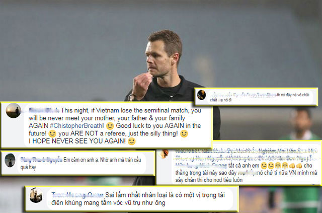 Chứng kiến điều này, rất nhiều fan hâm mộ bóng đá Việt Nam đã “truy tìm” Facebook cá nhân của trọng tài Chris Beath để xả giận. Thậm chí, fan Việt dùng nhiều lời lẽ khó nghe, xúc phạm nhắm đến vị trọng tài người Úc