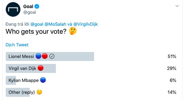 Ngay sau khi danh sách đề cử giải thưởng The Best 2019 được công bố, tờ Goal đã mở một cuộc bình chọn dành cho các CĐV trên mạng xã hội. Không nằm ngoài dự đoán, siêu sao Lionel Messi tạm dẫn đầu với tỉ lệ bình chọn lên đế 51%. Thủ quân CLB Barca bỏ xa người xếp sau là trung vệ Van Dijk khi cầu thủ này chỉ tạm đạt được 29% tỉ lệ bình chọn.
