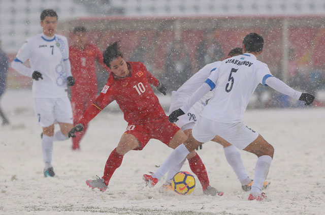 Tiếp đến là việc mặt sân phủ đầy tuyết trắng khiến lối đá phụ thuộc vào kỹ thuật và lối đá ngắn, ban bật của U23 Việt Nam khó có thể phát huy được tác dụng. Còn U23 Uzbekistan với thể lực, thể hình tốt hơn đã dễ dàng triển khai những đường bóng bổng làm vũ khí tấn công.