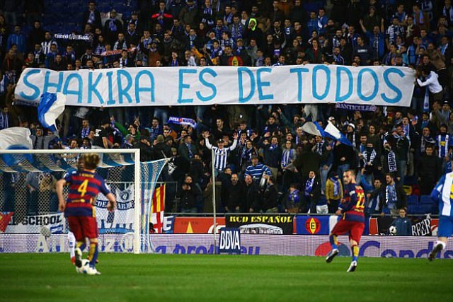 Ở trận derby xứ Catalan trong khuôn khổ vòng 22 La Liga diễn ra vào cuối tuần trước, các CĐV Espanyol tiếp tục “bày trò” chọc tức Pique và lần này họ đã mắc sai lầm lớn khi mang bạn gái Shakira của anh ra làm “bia ngắm”. Cụ thể, trên khán đài của sân Cornella El Prat, các CĐV đội nhà đã giăng tấm băng rôn khá lớn với dòng chữ: “Shakira es de todos” - (Shakira là của mọi người).