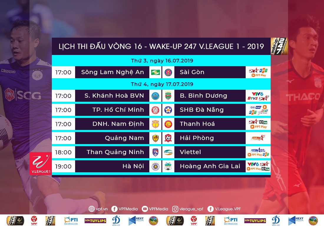 Trận đấu diễn ra sớm nhất vòng 16 V.league 2019 là cuộc chạm trán giữa Sông Lam Nghệ An và CLB Sài Gòn lúc 17h00 ngày 16/7.