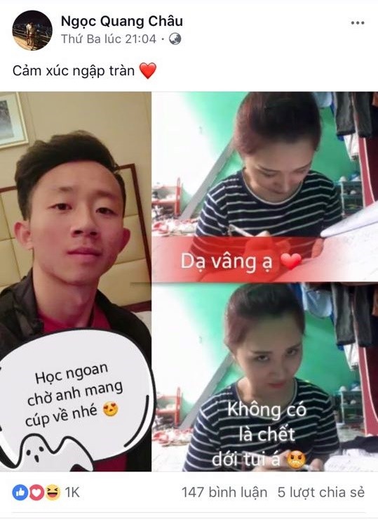 Trong tấm ảnh được Châu Ngọc Quang đăng tải trên mạng xã hội có những dòng chữ đối đáp đầy thú vị. Châu Ngọc Quang hứa: “Học ngoan chờ anh mang Cúp về”. Bạn gái của tiền vệ này đáp lại: “Vâng ạ, không có là “chết” tui á”.