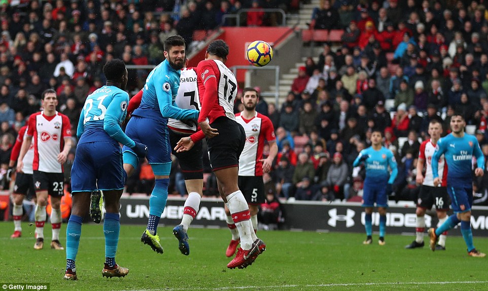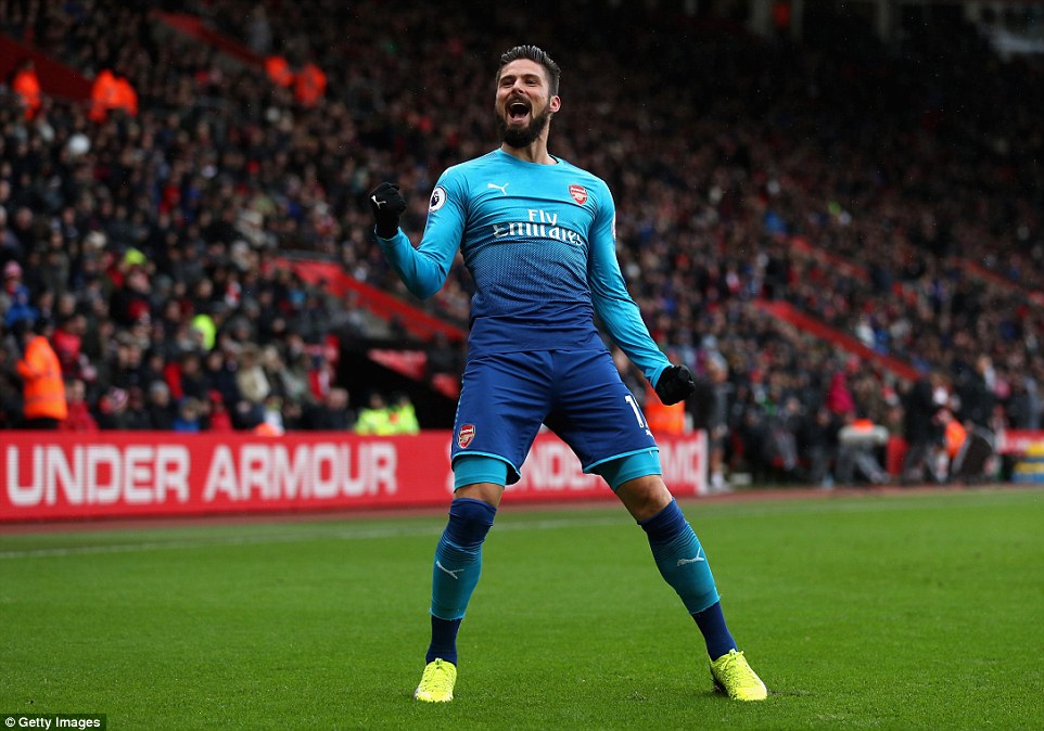 Phút 88, từ đường tạt bóng cầu may của Sanchez, Giroud bật cao đánh đầu tung lưới Southampton giật lại 1 điểm quý giá trên sân khách.