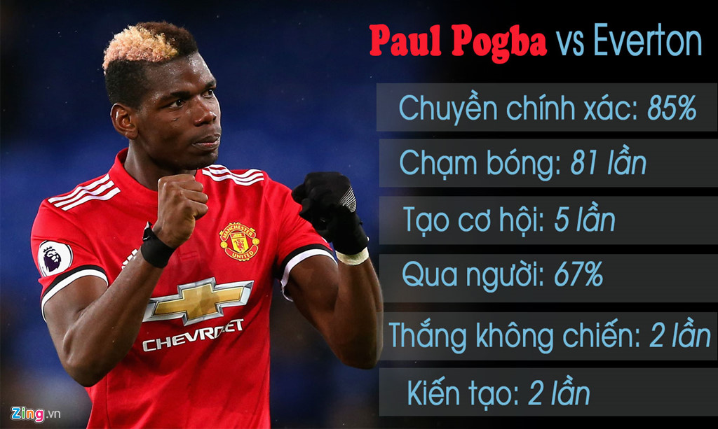 Thống kê về màn trình diễn ấn tượng của đội trưởng Pogba trong chiến thắng 2-0 trước chủ nhà Everton. Ảnh Zing.