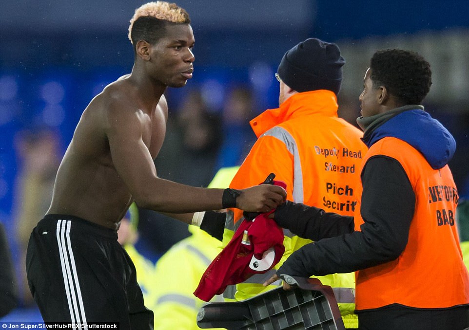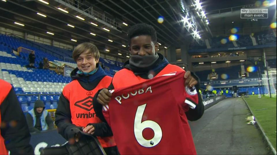Sau trận đấu, Pogba gây bất ngờ khi tiến thẳng về phía góc sân để trao chiếc áo đấu còn đẫm mồ hôi cho một cậu bé nhặt bóng da màu như mình.