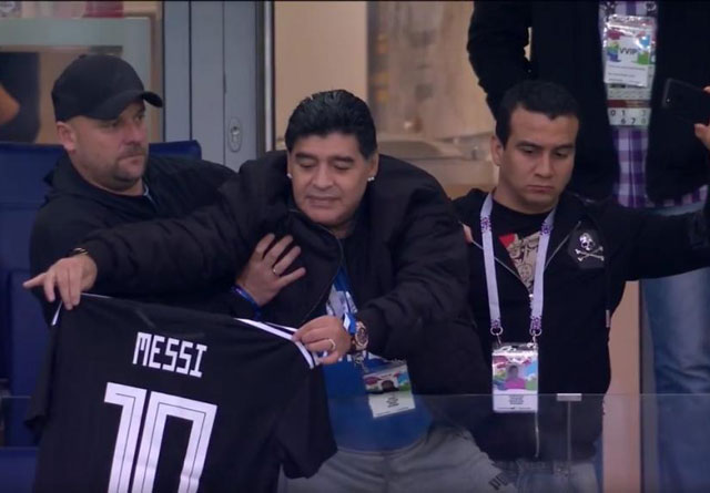 Tuy nhiên, điều này có vẻ như không quan trọng đối với Maradona khi ông vẫn tự tin khoe áo Messi trên khán đài.