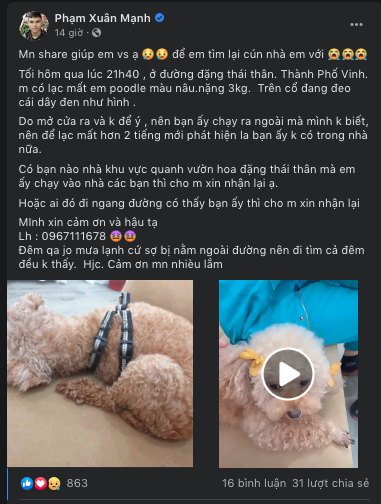 Đã hơn nửa ngày kể từ khi đăng tải dòng trạng thái thông báo mất thú cưng, Xuân Mạnh vẫn chưa chia sẻ gì thêm về tình hình sự việc. Điều này khiến NHM đoán rằng anh chàng vẫn chưa thể “hội ngộ” với chú cún của mình.