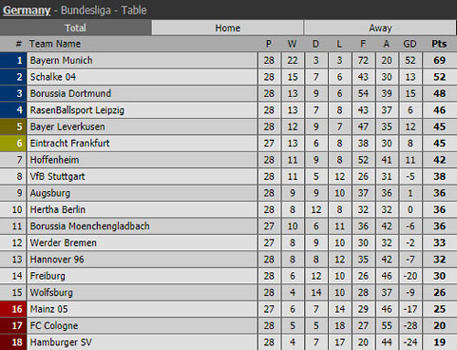 Tương tự như Man City, Bayern Munich cũng không có đối thủ tại Bundesliga. Ở trận Siêu kinh điển của bóng đá Đức diễn ra đêm qua, “Hùm xám” đã “vùi dập” đối thủ đáng gờm nhất là Borussia Dortmund với cách biệt 6 bàn không gỡ. Chiến thắng này giúp họ tiếp tục xây chắc ngôi đầu khi có được 69 điểm sau 28 trận, bỏ xa đội xếp sau là Schalke 04 tới 17 điểm.