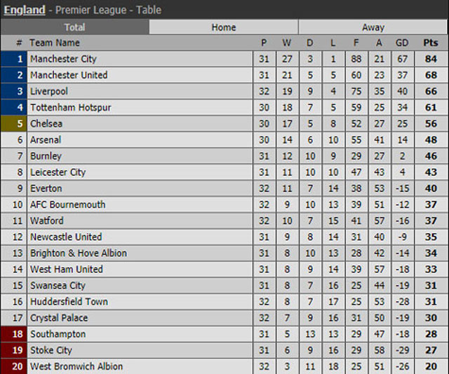 BXH Premier League sau các trận đã kết thúc ở vòng 32.