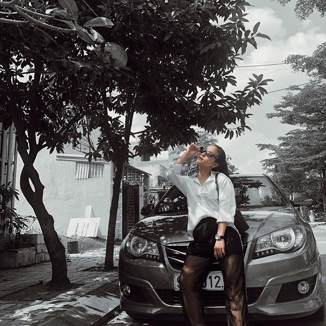 Nhật Lê tự tin tạo dáng bên xe sang cùng chiếc quần cực chất.