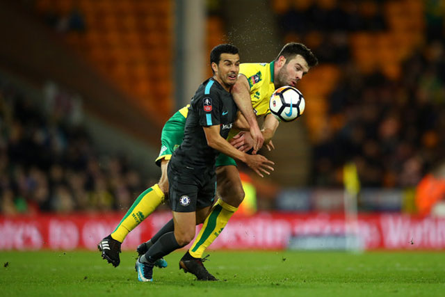 Chelsea vừa bị Norwich (áo vàng) cầm hòa ở vòng 3 FA Cup.