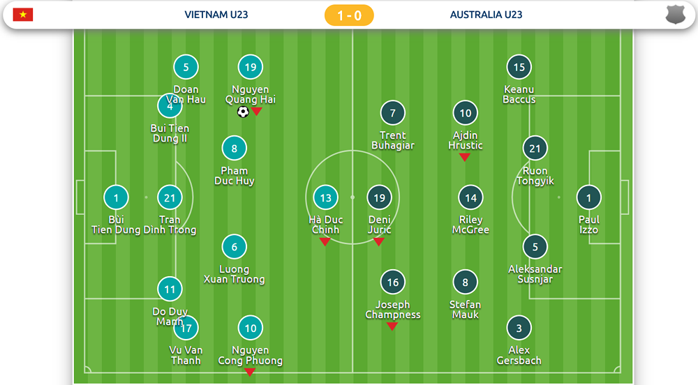 Cụ thể, Văn Hậu và Văn Thanh đã đá vai trò hậu vệ trong thế trận bị U23 Australia dồn ép. Tức hàng thủ U23 Việt Nam đá với 5 cầu thủ phòng ngự. Trong khi đó, Quang Hải, Công Phượng và Đức Chinh túc trực ở phía trên để chờ chực các pha phất bóng phản công nhanh.
