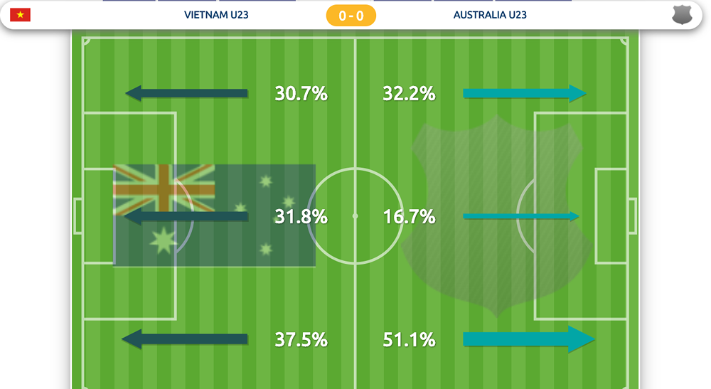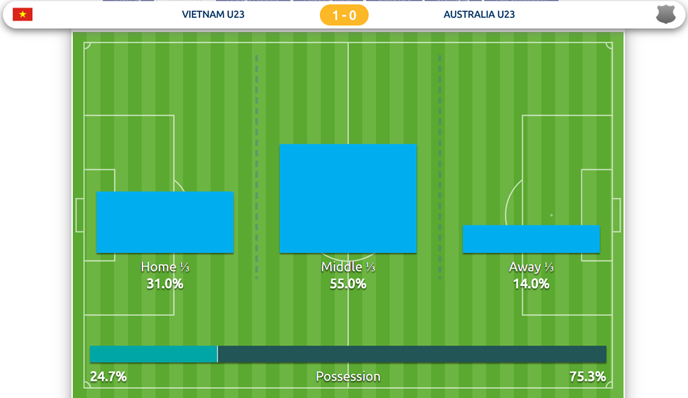 Thời lượng kiểm soát bóng của U23 Australia lên đến 75,3%.