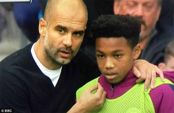 Hình ảnh hài hước của Pep Guardiola và cậu bé nhặt bóng.