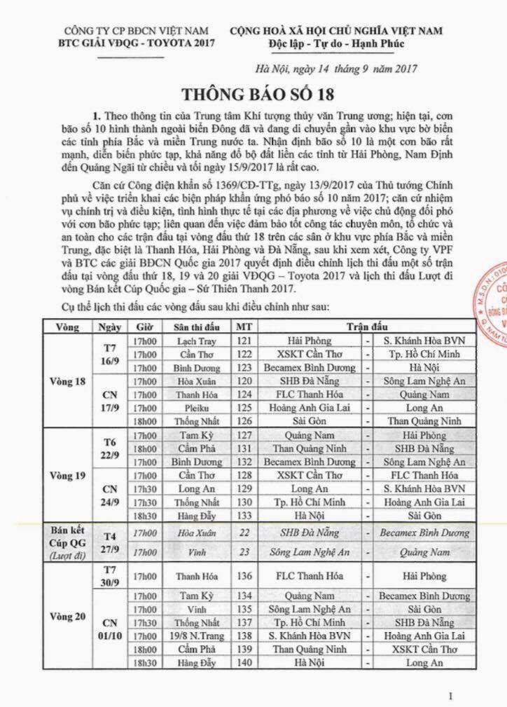 Ban tổ chức giải đã quyết định thay đổi lịch thi đấu của 8 trận V.League 2017 và 2 trận lượt đi vòng bán kết Cúp Quốc gia vì bão số 10. Theo dự báo, cơn bão số 10 sẽ đổ bộ vào các tỉnh miền trung chiều tối ngày 15/9 và khiến Việt Nam lần đầu tiên đưa ra mức cảnh báo nguy hiểm cấp độ 4 (mức 5 là mức thảm họa).