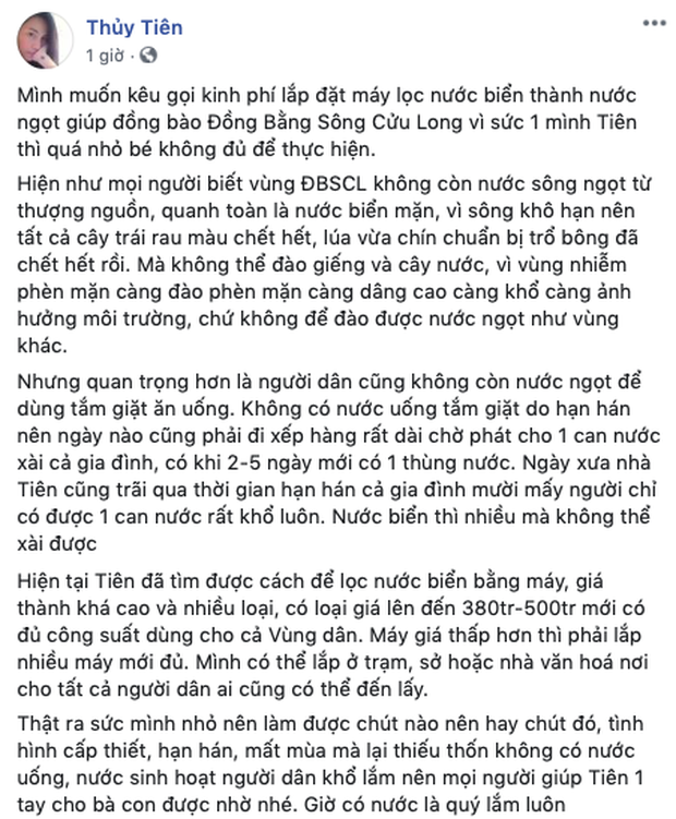 Tối 12-3, ca sĩ Thủy Tiên đã đăng tải lên trang cá nhân bài viết kêu gọi gọi người quyên góp tiền để mua máy lọc nước biển giúp nông dân miền Tây vùng hạn mặn.