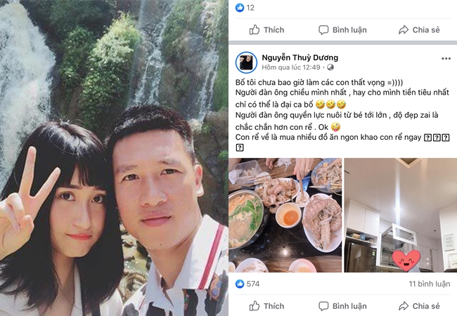 Gần đây, Thùy Dương đăng hình bữa ăn do bố nấu nhân dịp chàng con rể Huy Hùng về, cô nàng còn hóm hỉnh so sánh độ đẹp trai của chàng cầu thủ không thẻ nào bằng được bố vợ rồi: “Bố tôi chưa bao giờ làm các con thất vọng. Người đàn ông chiều mình nhất , hay cho mình tiền tiêu nhất chỉ có thể là đại ca bố. Người đàn ông quyền lực nuôi từ bé tới lớn , độ đẹp zai là chắc chắn hơn con rể .Con rể về là mua nhiều đồ ăn ngon khao con rể ngay”.