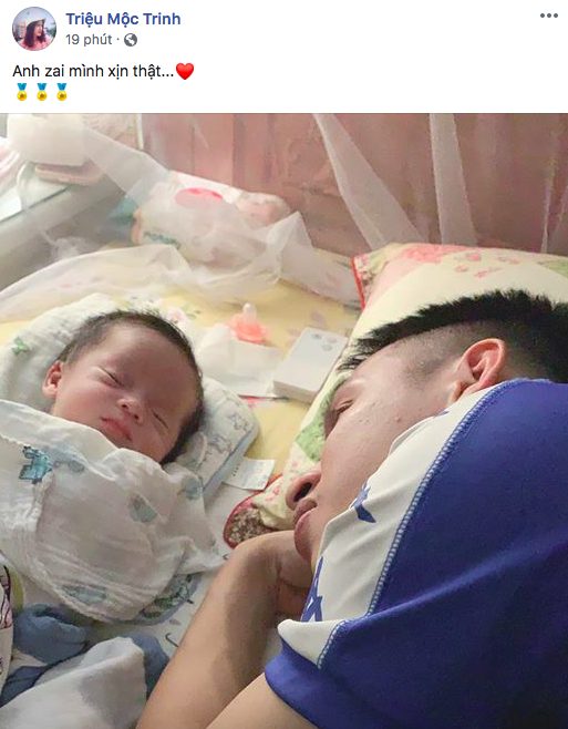 Trong khi đó, vợ của Đỗ Hùng Dũng - Triệu Mộc Trinh đã không kìm nén được sự vui sướng. Vợ Hùng Dũng đăng tải hình ảnh Hùng Dũng nằm ngủ cùng con: “Anh trai mình xịn thật”.