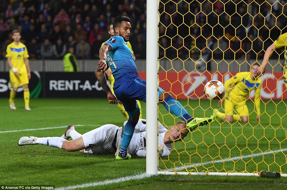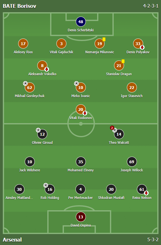 Đúng như phát biểu của HLV Wenger trước trận, Arsenal tung ra sân với đội hình gồm nhiều cầu thủ dự bị trong chuyến làm khách tới sân Borisov Arena. Tuy nhiên, các pháo thủ vẫn chơi lấn lướt và sớm định đoạt trận đấu ngay trong hiệp 1.