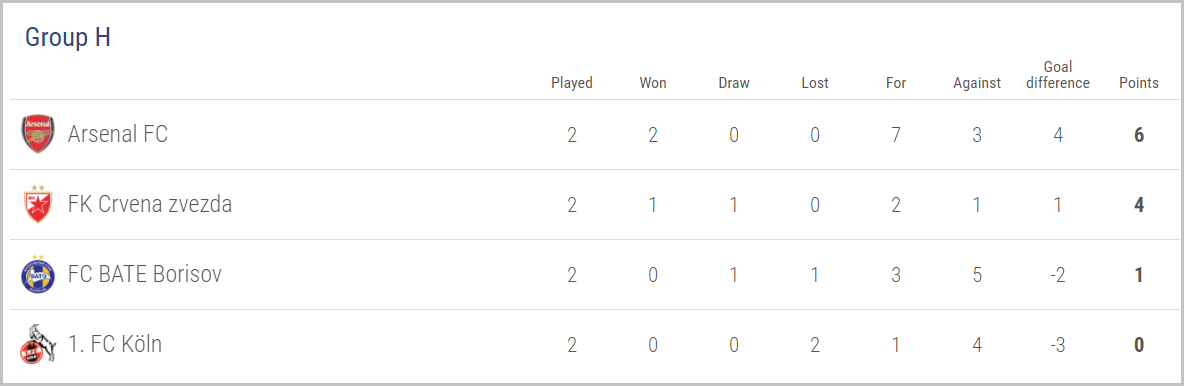 Thắng trận 4-2, Arsenal tiếp tục độc chiếm ngôi đầu bảng H với 6 điểm tuyệt đối. Ở trận đấu còn lại, Crvena Zvezda đánh bại Cologne 1-0 để vươn lên xếp thứ 2.