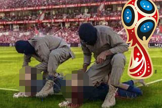 Công ty tình báo mạng Internet B2B của Israel - Sixgill vừa cho đăng tải những bức ảnh đáng sợ được nhóm khủng bố IS phát hành. Trong đó, có cảnh 2 siêu sao Cristiano Ronaldo và Lionel Messi bị 2 tên khủng bố ghim chặt đầu xuống mặt sân cỏ, kèm theo đó là lời chú thích sẽ chặt đầu cả hai và dùng máu đó để nhuộm đỏ mặt đất.