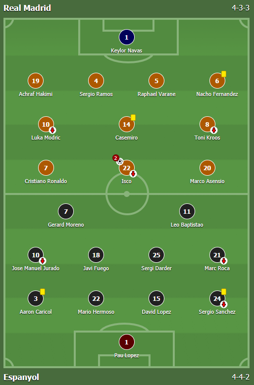 Vắng 3 trụ cột Marcelo, Bale và Cavajal nhưng được chơi trên sân nhà, Real Madrid vẫn dễ dàng kiểm soát thế trận trước Espanyol. Sự cơ động của hàng tiền vệ đem đến cho kền kền trắng nhiều giải pháp tấn công, trong đó điểm sáng đến từ cầu thủ nhỏ con Isco.